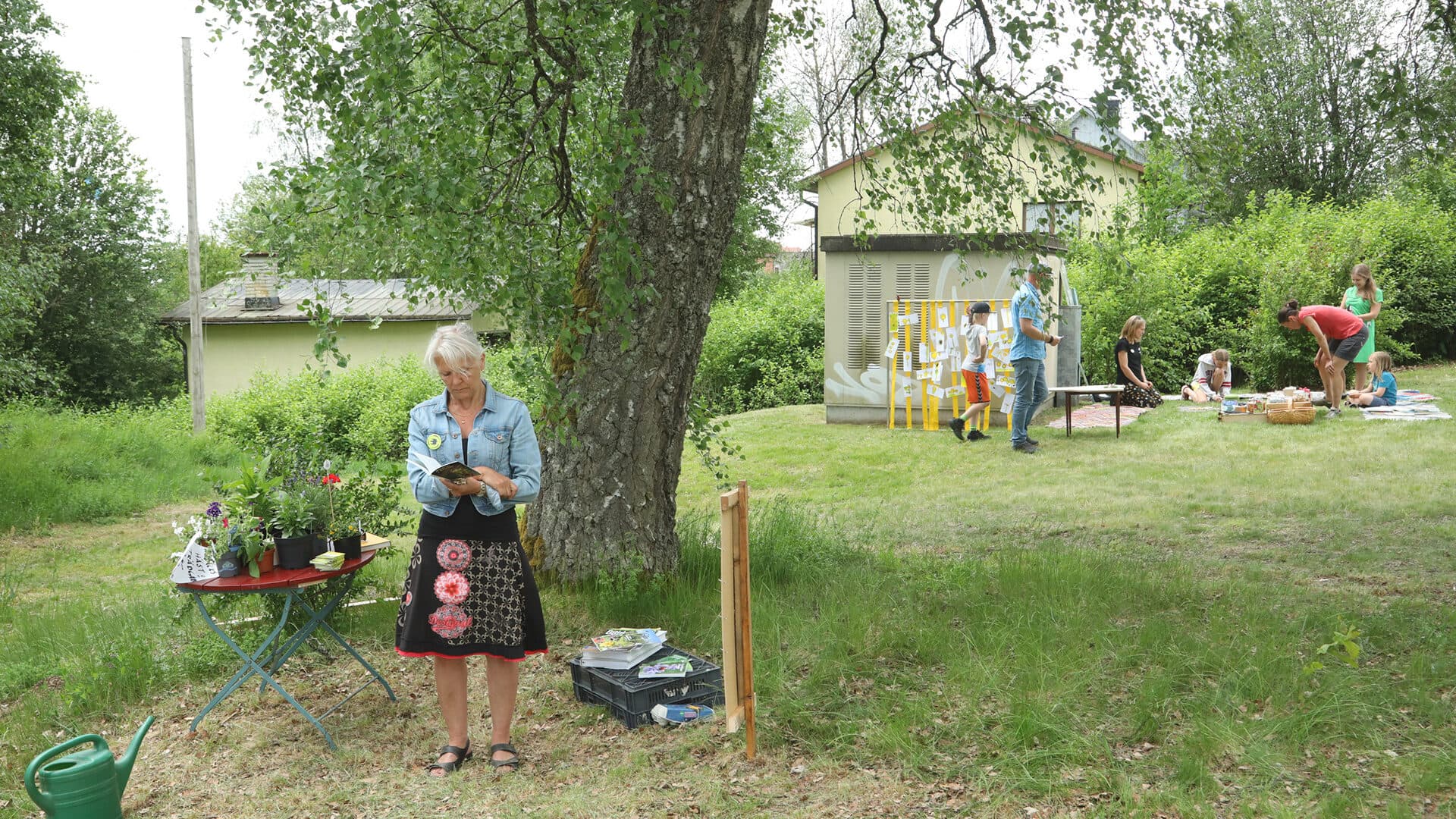 En härlig försommarkväll i maj månad bjöd naturskyddsföreningen i Vaggeryd in till en inspirationskväll med temat vildare trädgård. Vi hade lånat en ödetomt i Skillingaryd som låg granne med hembygdsgården, som även hade sina utställningar öppet under kvällen. Den vildvuxna tomten i kvarteret sälgen var perfekt för ändamålet och det enda vi behövde göra var att klippa små gångar som besökarna kunde vandra på. Målsättningen med kvällen var att inspirera och visa på små enkla åtgärder som alla kan göra i sin trädgård för att öka den biologiska mångfalden. Vi gjorde detta genom att skapa ett antal stationer med olika teman längs med slingan på ödetomten. Den första stationen handlade om sand och stenpartier och en mindre sandblotta hade skapats. Till detta hade vi informationskyltar och böcker som handlade om sandgynnade arter. Övriga stationer handlade om slåtteräng, fjärilar, vatten, ostädade områden, träd och buskar. Hasselmusholk, fladdermusholk, igelkottshus och olika bihotell hade placerats ut och det fanns litteratur som besökarna kunde kika i. Tack vare att Hembygdsföreningen skapat en slåtteräng i hembygdsparken så kunde vi lägga den stationen där. Vi utförde även en inventering av slåtterängens växter åt hembygdsföreningen som vi ska följa upp kommande år.
